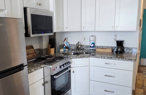 Fully furnished unit that sleeps four. One queen bed and a sleeper sofa. A flat screen smart tv for streaming, cable and Wi-Fi included. The full kitchen is equipped with refrigerator and freezer, stove and microwave. Dishes, cookware, cooking utensils and silverware all provided.