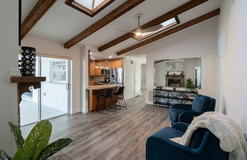 The living area features an open floor plan that is perfect for entertaining. The kitchen is fully equipped with a blender, electric stove, coffee machine, toaster, dishwasher, and beautiful granite countertops.