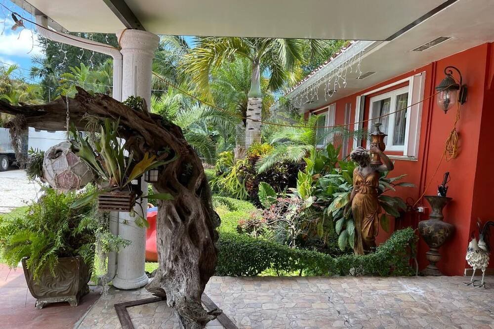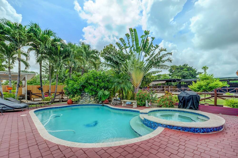Fully renovated in and out!! Two large bedrooms and one room with sofa can be used as third bedroom. Kitchen with quartz countertops, stainless Steel Appliances, lots of cabinets! Two and 1 1/2 baths. Large living room with large Tv. Dining room with Great views. Relaxing Large Pool with new heating system and outdoor bathroom. Extra-large tiki for a large gathering. The outdoor is surrounded by Palm Trees, Fountain and the peaceful sound of bird and horses. The farm is located in a Quiet Central Neighborhood close enough to Stores, Restaurants, shopping malls. Parking for 13 cars.
