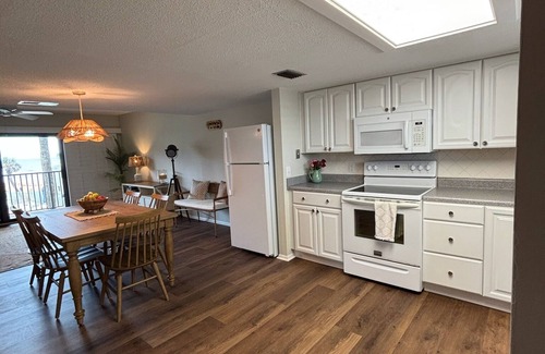 The unit has recently undergone some renovations and upgrades & is decorated to make you feel like you are truly at your home away from home! The main floor has an open floor plan which includes a half bath, dedicated dining area & an adjoining living room- & flows right into the kitchen… so even if you are the one cooking up some dinner - you won’t miss out on the family conversation or game night. The living room has sliding glass doors that lead out to the balcony which has an additional sitting area from which to enjoy the breeze & pool and ocean views. Storm style shutters can be drawn at night for extra privacy!