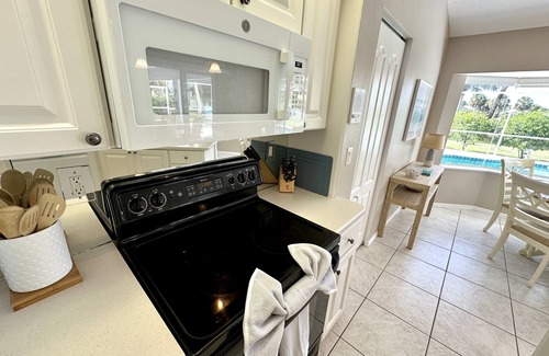 Step inside to discover an inviting open concept living space adorned with elegant vaulted ceilings, and ample natural light, exuding a sense of spaciousness and comfort. The living room boasts plenty of comfortable seating, flat screen smart TV, and big pocket sliders to the lanai area capturing the essence of Florida living at its finest! The formal dining room has a table for 6, perfect for all your holiday celebrations! The well-equipped kitchen has nice finishes, plenty of cabinets, dishwasher, microwave, Keurig K-Duo single serve & carafe coffee maker, breakfast bar for your morning coffee, and everything you’ll need to cook your favorite recipes. Adjoining the kitchen is a sunny nook area with a dining table and a large aquarium window, offering a spectacular view of the pool!