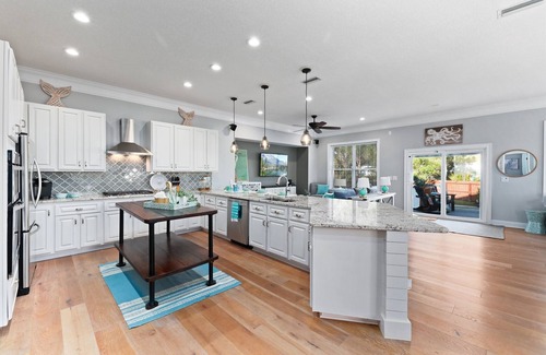 Step inside to find bright, open living spaces perfect for groups and families. The main living area features a large sofa with a queen pullout for extra guests, a Smart TV for family movie nights, and a seamless flow into the dining area and gourmet kitchen. With stainless appliances, a spacious island, and all the cookware you need, the kitchen is stocked for everything from quick breakfasts to full vacation feasts.