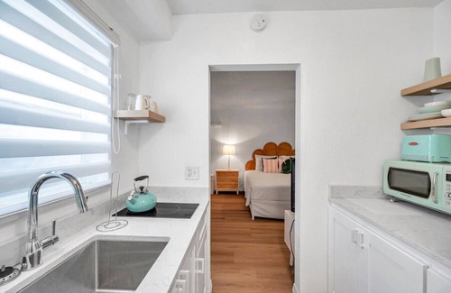 The Daiquiri Suite features a kitchenette complete with quartz countertops, a two-burner stove, and a full-size fridge. Prepare your favorite meals or enjoy a light snack at your convenience, providing the comforts of home during your stay. Sleep soundly in the bedroom area, adorned with a comfortable king-size bed. Rest and rejuvenate in the tranquility of your private sanctuary, ensuring a peaceful night`s sleep. Freshen up in the full bathroom, equipped with a convenient walk-in shower. Please note it is a COMPACT bathroom. Start your day with an invigorating shower or unwind in the evening with a relaxing soak, offering convenience and comfort. Freshen up in the full bathroom, equipped with a convenient walk-in shower. Start your day with an invigorating shower or unwind in the evening with a relaxing soak, offering convenience and comfort. Step just outside the front door to discover your own semi-private patio area. Bask in the fresh air, soak up the sun, or simply unwind with a good book in this charming outdoor space designed for relaxation and serenity. The suite comes complete with a full linen set, beach and bath towels, essential amenities, and complimentary WiFi.