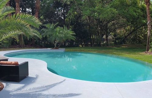 For nature lovers, this gorgeous property is located in a gated community just down the road from the main complex of the Swiss Waterski Resort. With a large, secluded and completely fenced in backyard, this pet-friendly stunning three-bedroom pool home sits at the end of a cul-de-sac tucked into an oasis of privacy and nature! The tropical landscape and private back garden offer bountiful enjoyment for birdwatchers and exquisite nightly sunsets! Enjoy soaking up the Florida sunshine at the west facing, infinity edge pool! Enjoy the sun loungers and outdoor seating at the water’s edge. Waterskiing and golfing are on-site, and the Orlando theme parks are only 40 minutes away.