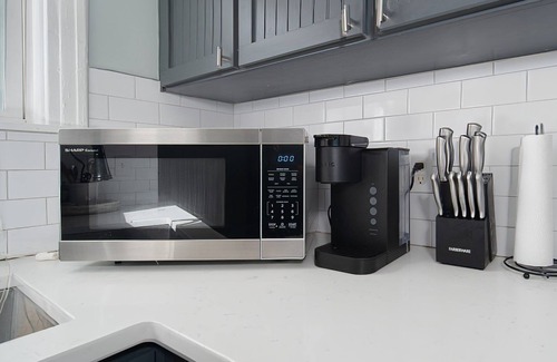 ✔️ The kitchen comes fully stocked with cooking basics, dishes and silverware, dishwasher, stainless steel electric stove, oven, coffee maker, microwave, refrigerator, freezer, hot water kettle, toaster, and baking sheet.