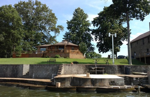 Large deck space provides plenty of room to enjoy the view while being right on the waters of the Elk River and across the side deck the Tennessee River can be viewed. Large Oak and Hickory trees provide shade for relaxing in the hammock or grilling out. Inside the cabin a good size great room with comfortable sofas is a perfect place to get out of the sun and cool down. The cabin provides two bedrooms with a small loft above. One bathroom and laundry along with a efficient kitchen all are ready for your use.