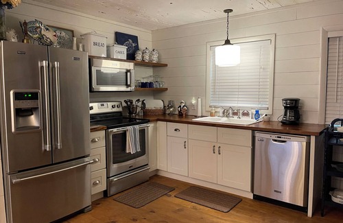 Fully remodeled, 2 bedroom 2 bath cottage with wood floors throughout and pecky cypress walls and ceilings. Outdoor living areas include 2 covered porches and a large open back deck. Large master bedroom with private bathroom, walk in closet, and a king size bed. Second bedroom features a queen size bed and private bathroom. There are two full size sofa beds located in the living room and family room. The dining room features a large, custom built-in banquette that seats up to 10 people. The new open floor plan kitchen overlooks the Family room, which includes a seating area surrounding the fireplace. Living room hosts comfortable seating around a 50” wall mounted flat screen TV. Outdoor shower.